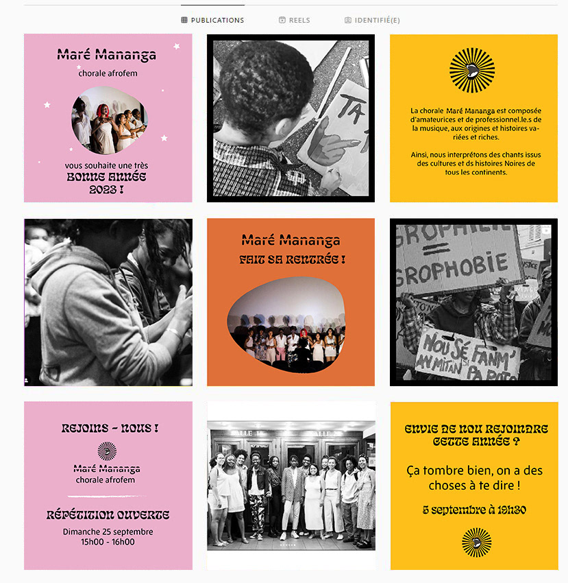 Projet personnel. Création d’une identité visuelle fictive pour Maré Mananga, une chorale afroféministe et décoloniale. Ce projet expérimental explore la création d’un univers graphique fort, engagé et collectif, à la croisée de la musique, de la transmission et des luttes politiques.